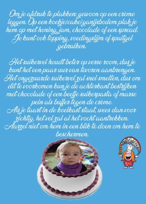 Personnalisez votre gâteau avec cette impression alimentaire. Il vous suffit de le poser sur le glaçage, le coller avec du miel, du glaçage ou du chocolat sur votre gâteau.